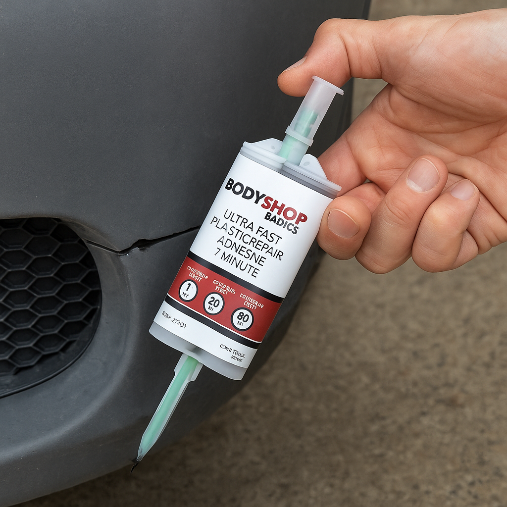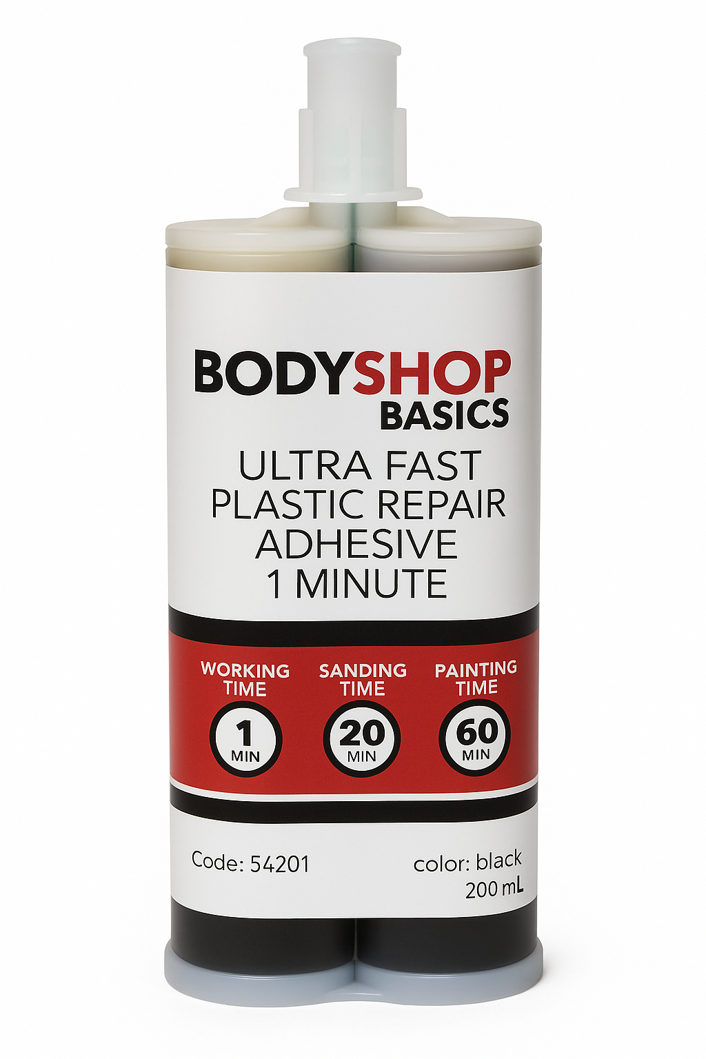 BodyShop Basics plastic repair adhesive is a fast-curing, professional-grade 2-part adhesive designed for quick automotive plastic repairs.